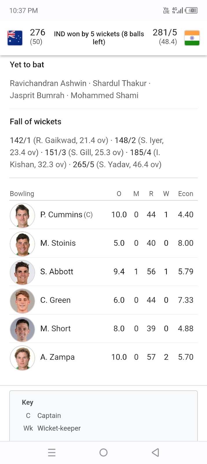 IND won by 5 wickets (8 balls left)